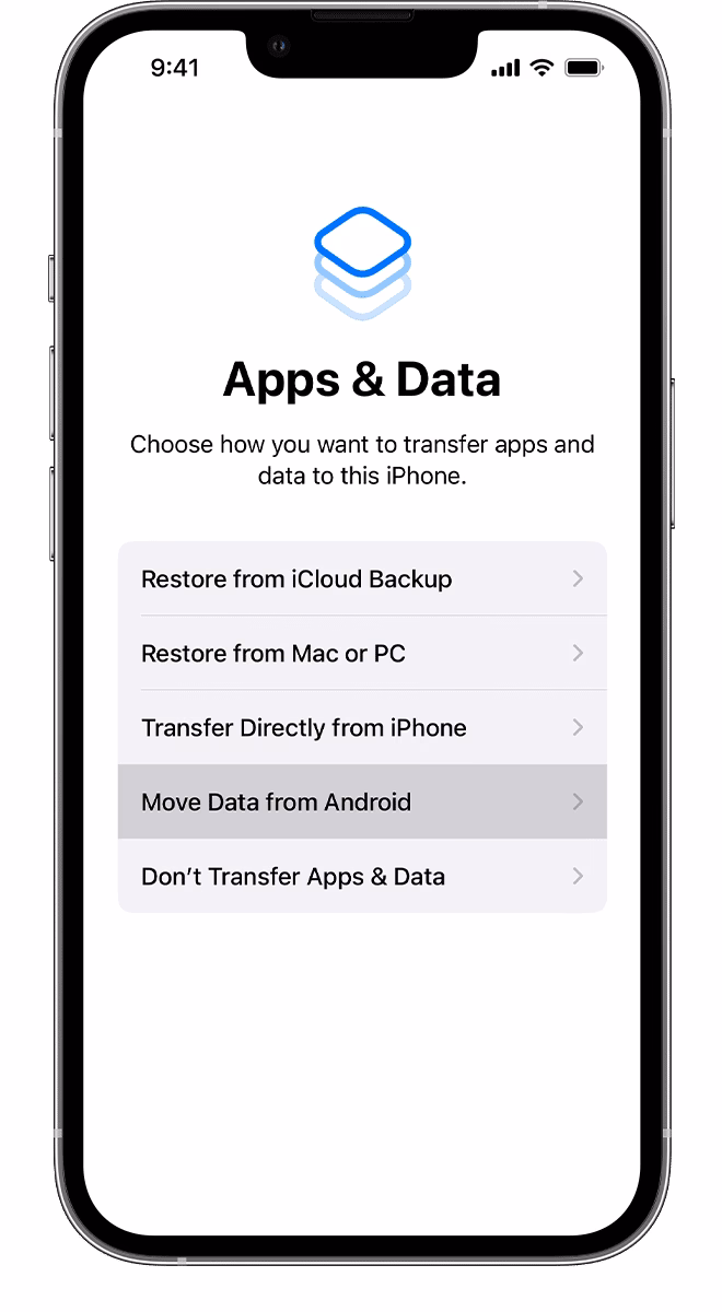 - Start iPhone-opsætning: Følg opsætningsvejledningen på din iPhone. Når du når skærmen 'Apps & Data', skal du vælge 'Flyt data fra Android'.