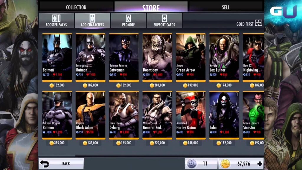 Guldkarkaterer er toppen af fødekæden i Injustice Mobile. De er de mest magtfulde og naturligvis de mest eftertragtede karakterer i spillet. Med betydeligt højere grundstatistik, unikke og ofte spilforandrende passive evner, samt adgang til kraftfulde specialangreb, er guldkarkaterer rygraden i ethvert seriøst hold.
