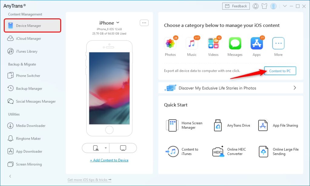 - Nem backup: Du kan nemt sikkerhedskopiere alt indhold fra dine iOS-enheder til din computer med ét enkelt klik, herunder musik, kontakter, beskeder, fotos, noter og købte varer.