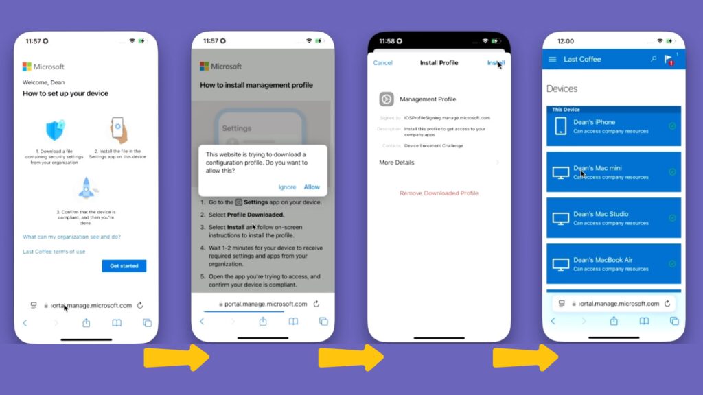 - Company Portal App: Brugerne starter med at installere Company Portal appen, hvor de logger ind med deres organisationens legitimationsoplysninger. Dette er ideelt, hvis du ønsker at tvinge MFA, adgangskodeopdateringer eller registrering i Microsoft Entra ID under tilmeldingen.