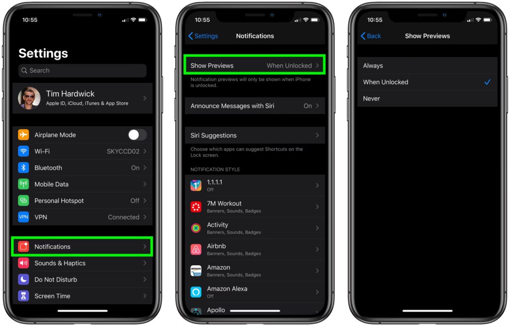 Adjusting message preview settings is easy. Here’s how: Go to Settings. Scroll down and tap Messages. Tap Notifications. Tap Show Previews. Always shows message previews even when your iPhone is locked. When Unlocked only shows message previews when the phone is unlocked. Never Disables message previews completely.