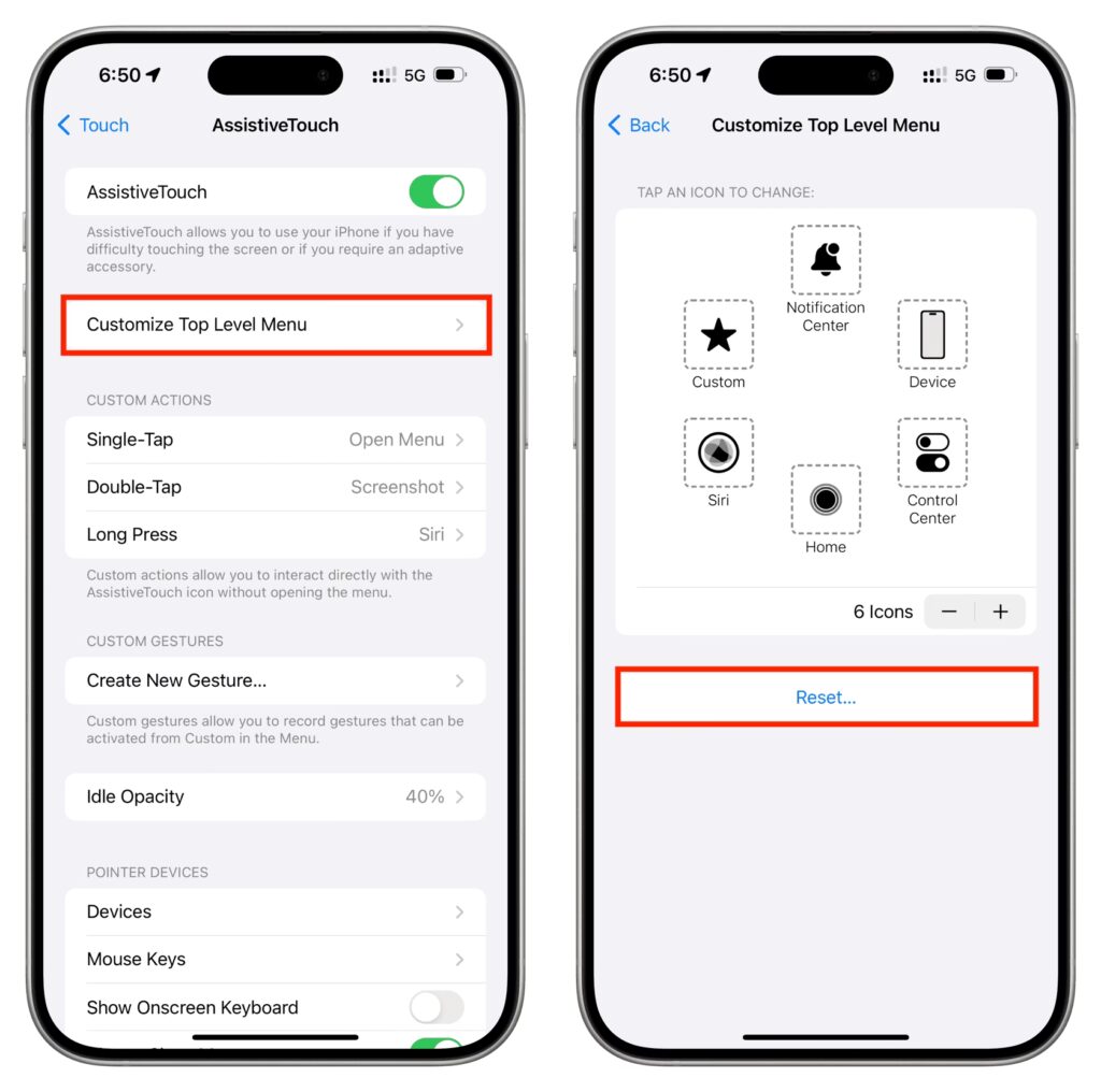Hvis simpel genaktivering ikke virker, kan du prøve at nulstille AssistiveTouch til dens standardindstillinger. Dette nulstiller især menuen og tilpasningerne, hvilket kan rette fejl, der er opstået på grund af forkerte indstillinger.