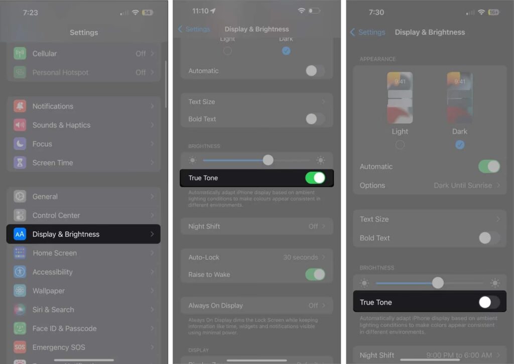 - Tjek True Tone og Night Shift: Selvom disse funktioner ikke direkte dæmper skærmen, ændrer de skærmens farvetemperatur, hvilket kan give en opfattelse af, at skærmen er mørkere eller mindre levende.