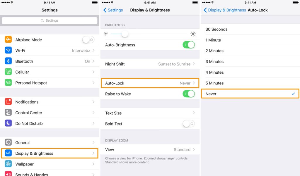 Som et resultat kan du tro, at din iPhone ikke låser og slukker skærmen, men det er ikke tilfældet. Din iPhone låser automatisk som indstillet. Den vækker blot skærmen, når du løfter din iPhone, piller ved den, eller endda berører skærmen ved et uheld. Hvis du ønsker at deaktivere disse funktioner for at forhindre utilsigtet skærmvækning, kan du gøre det: