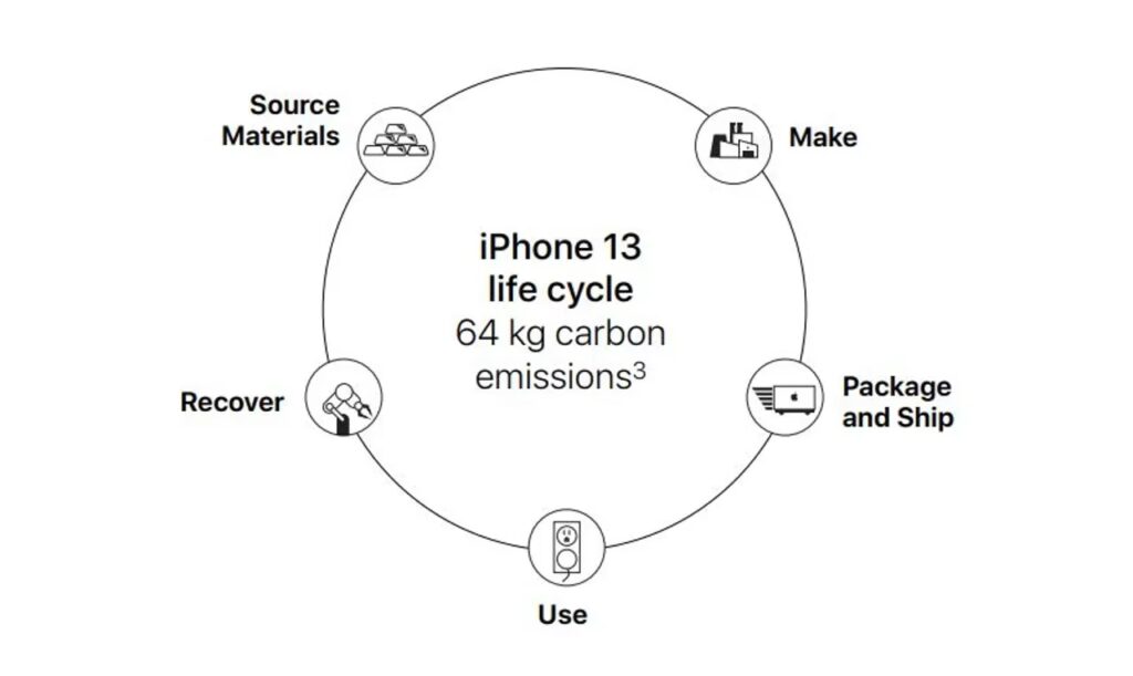 Ifølge Apples egen miljørapport fra september 2021 udleder en iPhone et samlet CO2e-aftryk på 64 kg. Dette tal blev specifikt beregnet for en iPhone 13-model med en lagerkapacitet på 128 GB. Det er vigtigt at bemærke, at dette samlede beløb af drivhusgasemissioner (GHG) blev estimeret ved hjælp af Life Cycle Analysis (LCA)-metoden. Dette betyder konkret, at det samlede emissionsbeløb, der annonceres i denne rapport, normalt inkluderer alle de emissioner, der genereres af en iPhone gennem dens livscyklus – fra udvinding af råmaterialer til endelig bortskaffelse. Til sammenligning var CO2-fodaftrykket for en iPhone 12 med samme lagerkapacitet (128 GB) 72 kg CO2e, hvilket indikerer en positiv nedadgående tendens i Apples rapporterede tal.