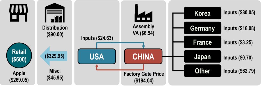 For eksempel kan dele af iPhone-kameraet og glasskærmen være fremstillet i Japan, mens elementer af batteriet kommer fra Kina, og accelerometret – der sporer telefonens acceleration og muliggør geografisk orientering – er bygget i Tyskland. Efter at have indkøbt disse komponenter sendes delene til fabrikker, typisk i Asien, hvor de samles, før de færdige iPhones sendes til lagre og derefter til forhandlere verden over. Denne model maksimerer effektiviteten og udnytter specialiserede produktionskapaciteter globalt.