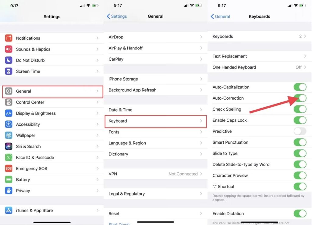 - Sørg for, at autokorrekt er slået til: Selvom det lyder indlysende, kan autokorrekt ved et uheld være blevet slået fra. Gå til Indstillinger > Generelt > Tastatur og sørg for, at Autokorrektion er slået til (grøn skyder).