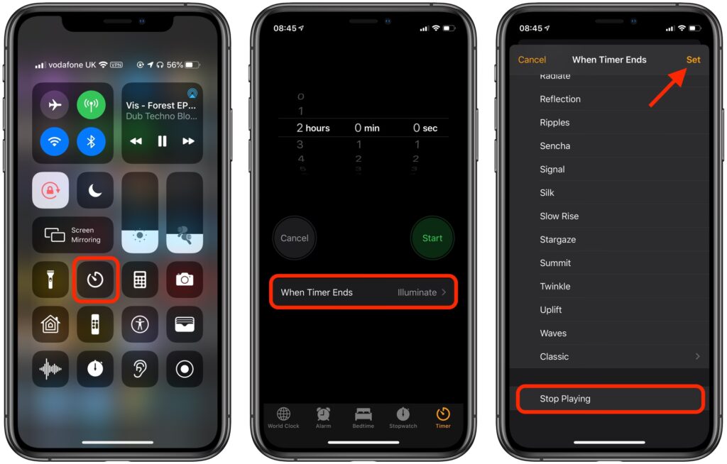 Når du har valgt "Stop Afspilning", skal du trykke på "Indstil" i øverste højre hjørne. Derefter trykker du på "Start" for at aktivere timeren. Nu er du klar til at gå i seng!