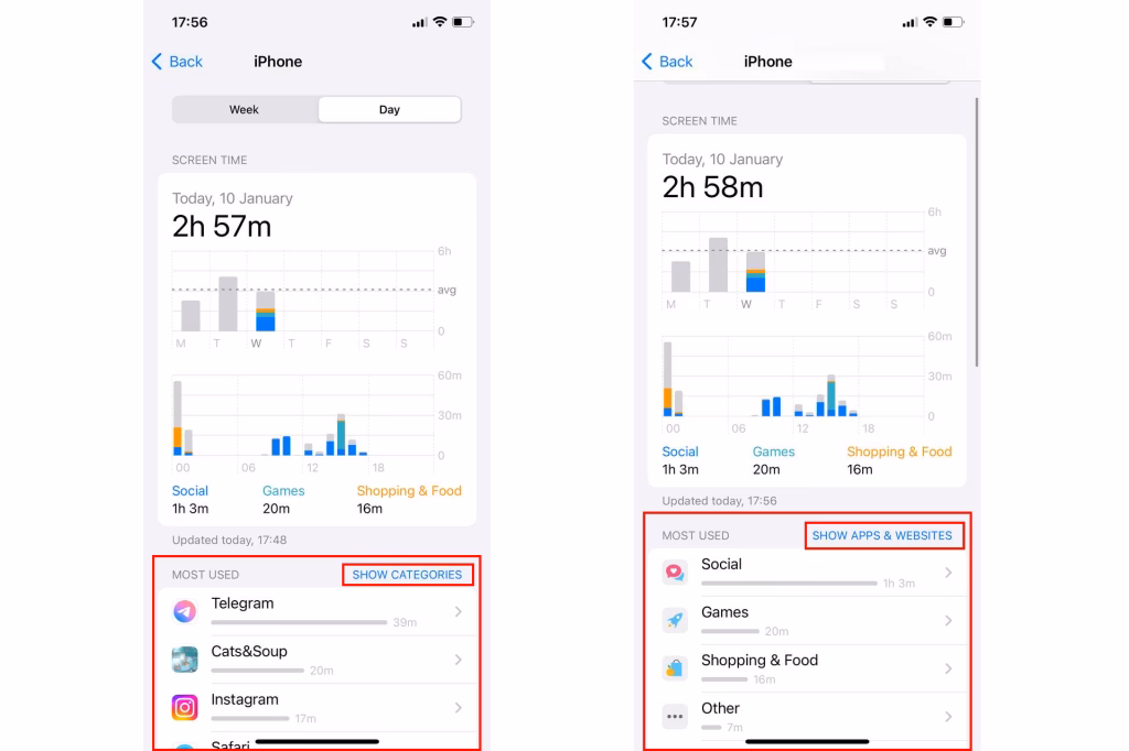 - Samlet Skærmtid: Den samlede skærmtid repræsenterer den tid, du bruger på din iPhone i løbet af dagen. Det inkluderer både aktiv brug, såsom browsing af apps eller visning af videoer, og passiv brug, såsom at lade skærmen være tændt uden aktivt at interagere med enheden.