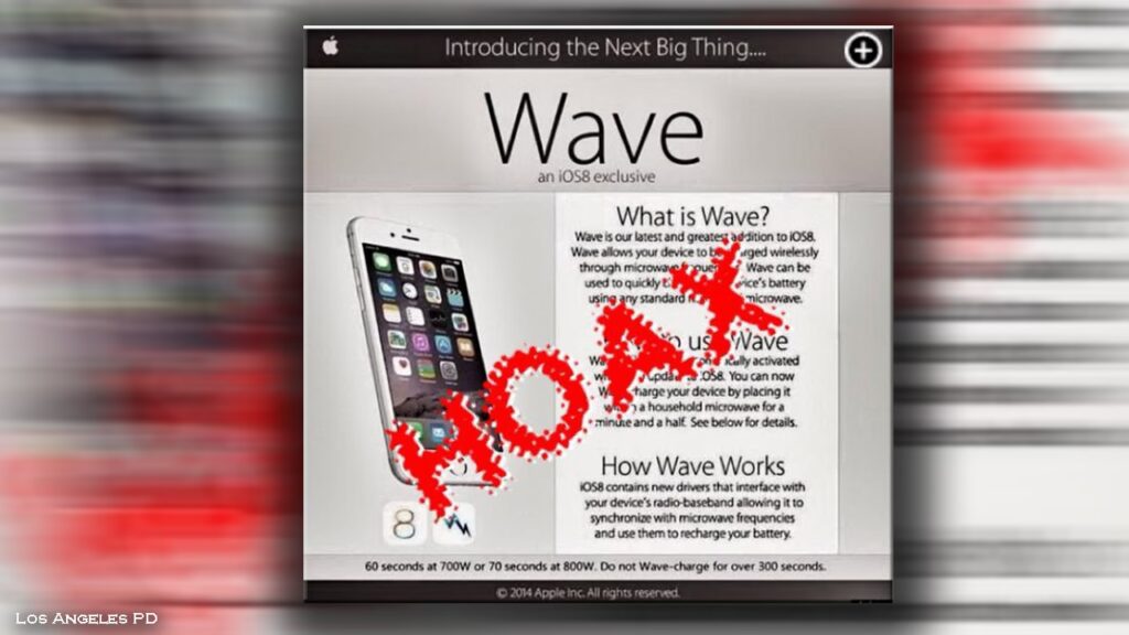 Just in case you were wondering, you cannot charge your iOS 8 device by putting it in the microwave. But for those who are unsure, the Los Angeles Police Department (LAPD) stressed in a Tuesday tweet that an iOS 8 microwave-charging feature, dubbed Wave, that has been circulating on the Interwebs is, in fact, fake.
