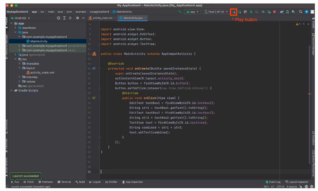 2. Kør App'en: Klik på den grønne 'Run'-knap (en trekant) i værktøjslinjen. Android Studio vil nu bygge din app og installere den på den valgte enhed eller emulator.