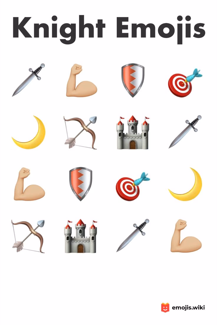 • Armor (Rustning): Selvom der ikke er en specifik emoji for "rustning", kan billedet af rytteren i fuld rustning og elementer som hjelme, der kan findes i mere generelle kategorier, antyde dette.