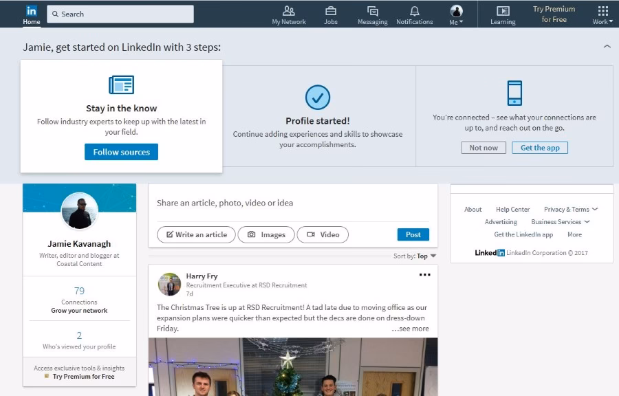 • Hjem: Indeholder dit LinkedIn-feed med opslag og artikler fra dine forbindelser, grupper og virksomheder, du følger. Du kan dele indhold, der skal ses af andre, samt følge eller stoppe med at følge virksomheder og personer for at få de opdateringer, du ønsker.