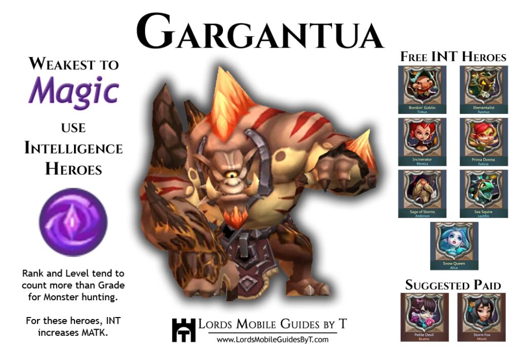 Det berygtede monster Gargantua vil ikke gøre din monsterjagt-sammensætning i Lords Mobile nogen tjenester. På grund af den fysiske skade, den påfører, skal du inkludere helingshelte i din sammensætning fra starten. I F2P-sammensætningen danner Incinerator, Elementalist, Snow Queen, Goblin Bomber og Child of Light en optimeret opstilling mod Gargantua fra niveau 1 til 3. For højere niveauer er det bedre at booste din heling med Prima Donna i stedet for Goblin.