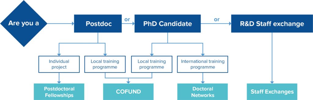 | Global Postdoctoral Fellowship | 12-24 mdr (udgående) + 12 mdr (retur) | Forskning uden for Europa efterfulgt af en returperiode i Europa. | Kræver en udgående fase til et land uden for Europa og en obligatorisk returperiode til et EU-medlemsland eller associeret land. |