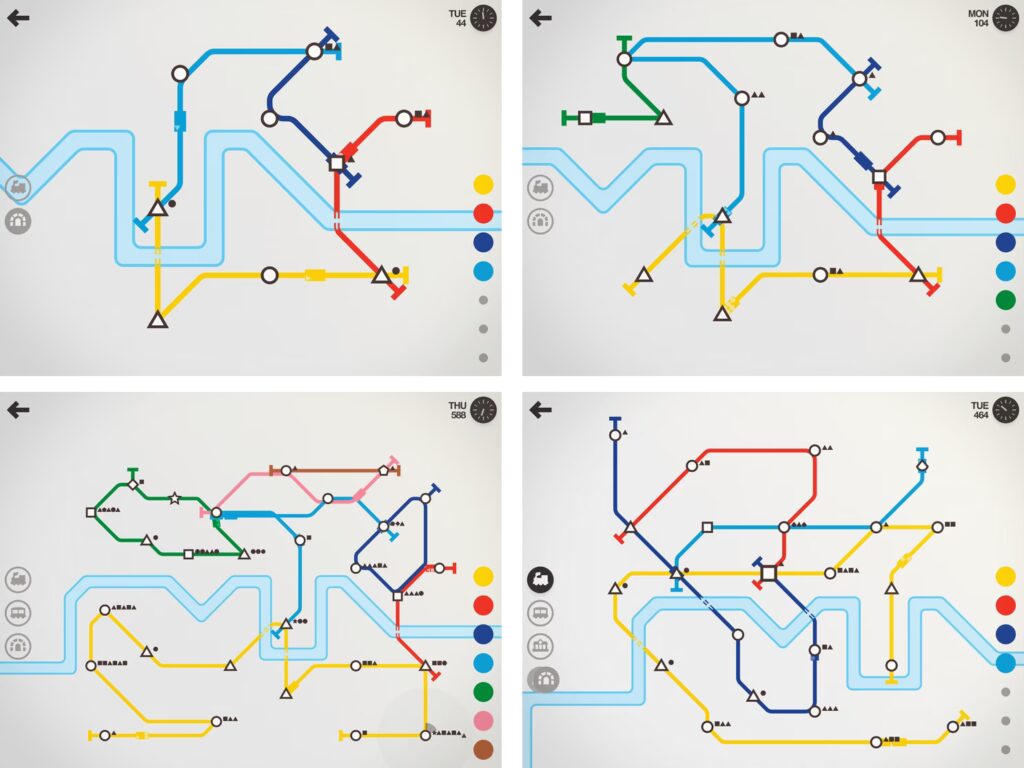 Spillets kerne består i konstant at tilpasse og optimere dit netværk. Efterhånden som nye stationer åbner, skal du omlægge dine linjer for at holde dem effektive og forhindre overbelastning. Hver beslutning tæller, da du har begrænsede ressourcer til rådighed. Skal du tilføje en ny tunnel? En ekstra togvogn? Eller måske en helt ny linje? Disse valg er afgørende for, hvor længe du kan holde byen i bevægelse. Det unikke ved Mini Metro er, at tilfældig byvækst betyder, at hvert spil er unikt. Du vil aldrig opleve den samme udfordring to gange, hvilket sikrer en høj genspilsværdi og holder spillet friskt og spændende.