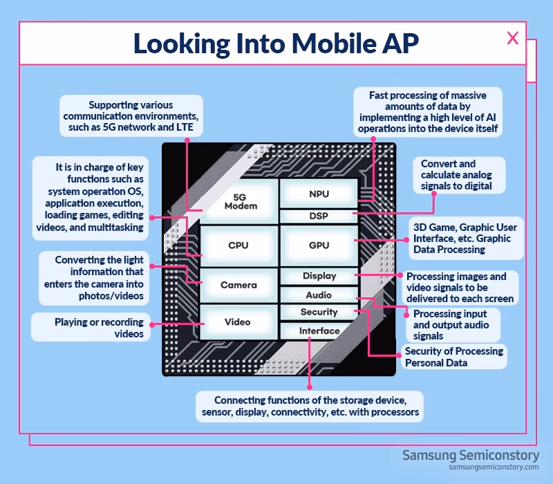Den mobile AP er også udstyret med en Neural Processing Unit (NPU) og en Digital Signal Processor (DSP), som er optimeret til kunstig intelligens (AI) og dyb læring. De bruges til hurtig og effektiv 'on-device' AI, hvilket betyder, at AI-beregninger udføres direkte på telefonen uden behov for at sende data til skyen. Dette forbedrer privatlivets fred, hastighed og effektivitet. Ansigt-, objekt- og stemmegenkendelse er alle mulige takket være NPU og DSP. Disse komponenter er fundamentale for funktioner som avanceret billedbehandling, smart batteristyring og personlige assistenter.
