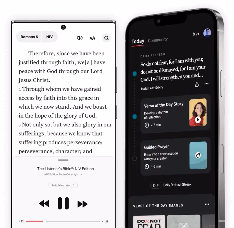 En af de mest populære funktioner i YouVersion er tilgængeligheden af lydbibler. Mange af de tilgængelige versioner kan lyttes til, hvilket er en fantastisk ressource for dem, der er visuelt udfordret, eller som foretrækker at lytte, mens de udfører andre opgaver. Appen tilbyder også et væld af læseplaner, andagter og studieressourcer, der hjælper dig med at engagere dig dybere i Guds Ord. Du kan fremhæve vers, tilføje noter, bogmærke passager og endda dele vers med venner og familie via sociale medier eller beskeder. YouVersion synkroniserer dine data på tværs af alle dine enheder, så du altid kan fortsætte, hvor du slap, uanset om du skifter fra telefon til tablet eller computer.