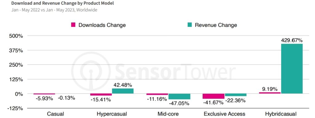 Hyper-casual-genren har oplevet et fald i markedsandel, mens hybrid-casual-spil er i fremmarch. Disse spil, som Voodoos Mob Control, blander elementer fra både hyper-casual og mid-core genrer for at tilbyde en frisk spiloplevelse. Mob Control kombinerer for eksempel PvP-elementer med karakterkortsamling, hvilket skaber en balance mellem annoncer (IAA) og køb i appen (IAP) som indtægtskilder.