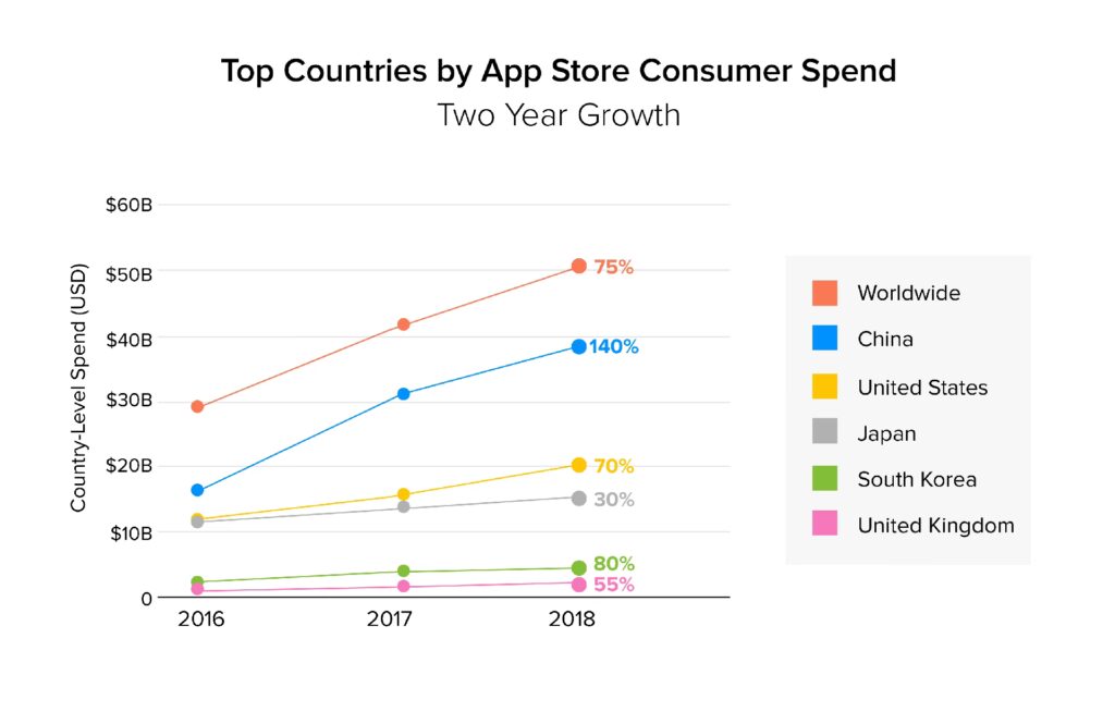 - Forbrugerudgifter i app-butikker er mere end fordoblet over de seneste to år og toppede 86 milliarder dollars i 2017. Forbrugerudgifter på verdensplan forventes at toppe 110 milliarder dollars i 2018 (TechCrunch, 2018).