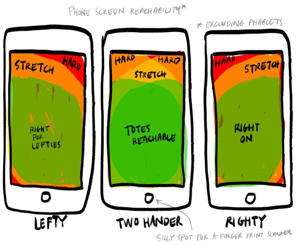 Generelt er den højre side, især det øverste højre hjørne, lettere at nå med tommelfingeren for højrehåndede brugere, når de betjener telefonen med én hånd.