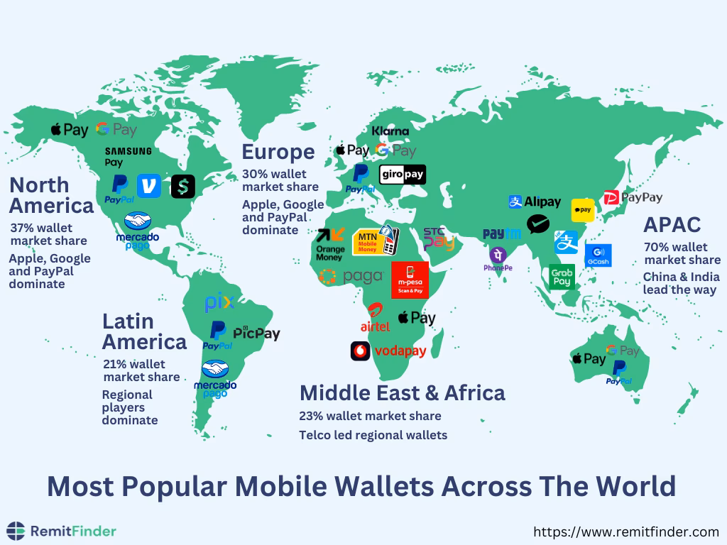Markedsandelen for digitale tegnebøger varierer betydeligt på tværs af regioner og lande. Forbrugerne bruger ofte mere end én digital tegnebog. I USA er Apple Pay den førende digitale tegnebog med en markedsandel på 38%, efterfulgt af PayPal (28%) og Google Pay (15%). Det er dog værd at bemærke, at mange brugere af Apple Pay også bruger PayPal, hvilket indikerer en vis overlapning i brugen.