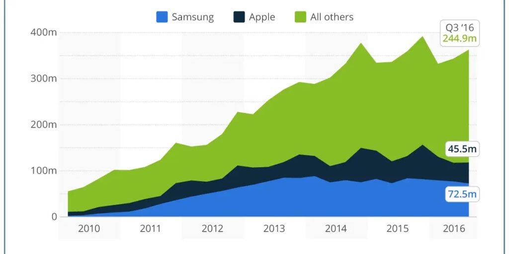 Teknologiske skift som overgangen fra 3G til 4G og nu til 5G har spillet en væsentlig rolle i at forme markedsandele. Producenter, der var hurtige til at implementere og optimere for disse nye netværksstandarder, opnåede ofte en konkurrencefordel. For eksempel, i 4. kvartal 2016 bidrog flagskibsmodeller og aggressive operatørkampagner i Nordamerika til vækst, delvist drevet af 4G-udrulninger. I dag er 5G en standardforventning i premium-segmentet, og adgangen til 5G-kompatible chipsets og modemmer er afgørende for at forblive konkurrencedygtig. Manglende evne til at tilbyde de nyeste netværksfunktioner kan føre til tab af markedsandel, især i udviklede markeder.