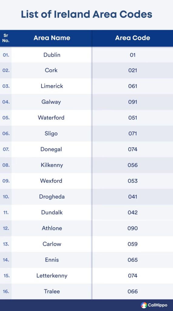 Telefonnumre i Republikken Irland har typisk 9 cifre, inklusive områdekoden. Numre i Nordirland (som er en del af Storbritannien) har normalt 10 cifre.