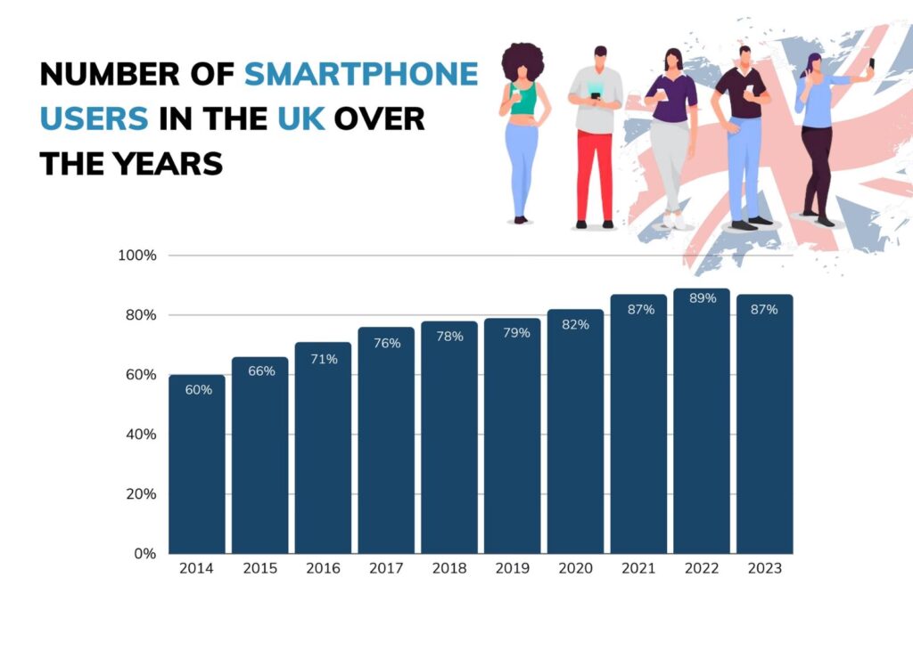 Siden mobiltelefonernes indtog i 1990'erne har adoptionen været eksplosiv. Fra at være et luksusgode forbeholdt få, er mobiltelefoner nu en integreret del af de fleste britiske husstande. Data fra Office for National Statistics (UK) viser en konstant stigning i mobiltelefonpenetrationen siden 1996. Mens specifikke tal for det samlede antal ejere ikke altid er direkte tilgængelige, giver procentdelen af husstande med mobiltelefoner et stærkt indicium på den generelle udbredelse.