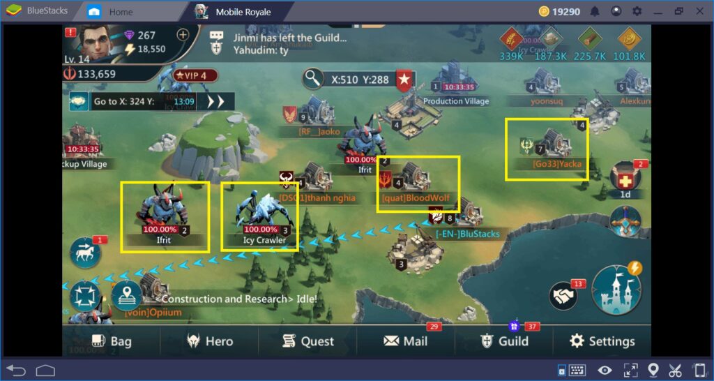 Dit allerførste skridt hver gang du logger ind, bør være at inspicere verdenskortet. Som nævnt i vores anmeldelse af Mobile Royale, vil de ressourcer, du producerer i dit kongerige, ikke være tilstrækkelige i midt-spillet. Du vil blive tvunget til at søge ressourcer på verdenskortet. Hvis du er heldig, kan du befinde dig tæt på ressource-spawnpoints. Dette betyder, at du kan samle manglende ressourcer på få sekunder uden at skulle deltage i kampe. Vær dog opmærksom på, at en sådan placering også kan være en ulempe. Andre spillere kan blive tiltrukket af din placering og forsøge at invadere dit kongerige, mens de angriber nærliggende ressourcepunkter. Du kan også ønske at flytte dit kongerige til et mere ressourcerigt område på kortet. Begge scenarier kan løses ved hjælp af teleport scrolls. Du modtager to gratis scrolls ved spillets start, og derefter kan de købes i Laugshoppen. Du har fuld kontrol over, hvor du ønsker at teleportere. Endelig er der NPC-byer på verdenskortet, som du kan besætte. Disse byer er ikke kontrolleret af nogen spillere, og ved at erobre dem kan du opnå forskellige passive bonusser. Disse byer er generelt nemme at erobre, så spild ikke tid på at spejde. Du kan administrere dine bonusser fra den dedikerede skærm.