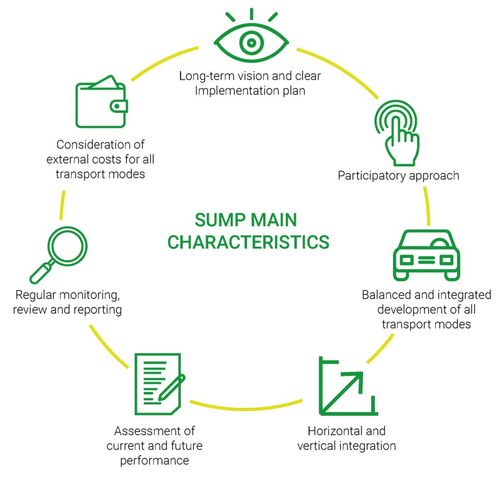 En SUMP prioriterer typisk offentlig transport, cyklisme, gang og andre former for grøn og delebaseret mobilitet, samtidig med at man optimerer brugen af biler og godsdistribution.