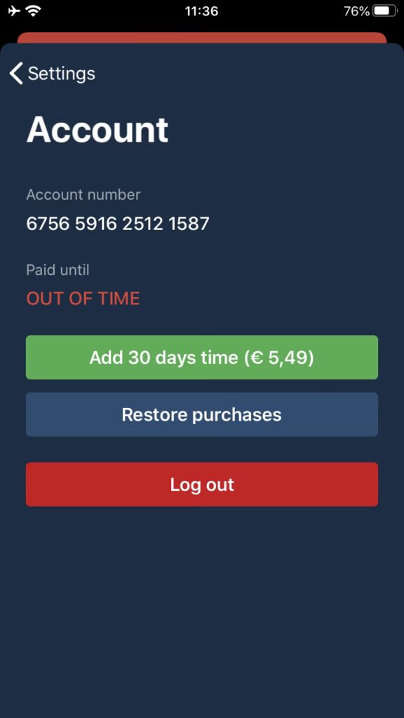 - Tilføj tid: Du kan trykke på "Tilføj 30 dages tid" for at tilføje tid til din konto via et in-app køb.