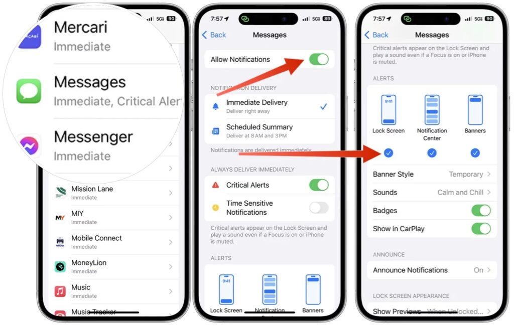 Det er muligt, at du ved et uheld har slået notifikationer fra for selve Beskeder-appen. Dette vil forhindre alle notifikationer i at blive vist på din låseskærm, notifikationscenter eller som bannere.