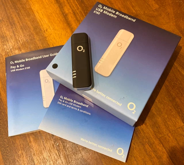 Vi har primært fokuseret på Pay-as-you-go-udgaven af O2’s mobile bredbånd, som inkluderer det førnævnte E160 USB-modem. Når du åbner pakken, finder du USB-modemmet selv, to små hæfter (hurtig start-guide og brugermanual), et USB-forlængerkabel (hvis du har brug for mere plads til donglen) og et O2 SIM-kort.