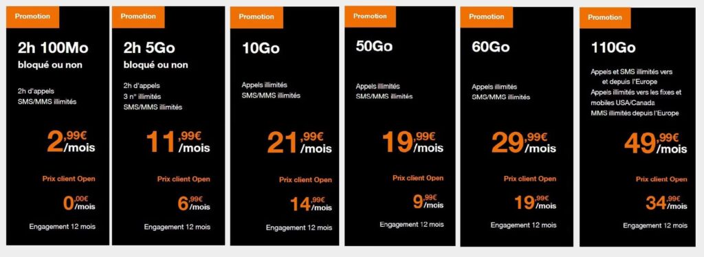 Bemærk: Priserne er vejledende og kan variere, især ved kampagner eller hvis man er eksisterende Orange-kunde med en bredbåndsforbindelse (f.eks. via 'Open packs'). Data angivet for Frankrig er den fulde mængde, mens EU/DOM angiver den del, der kan bruges i EU-lande og oversøiske departementer.