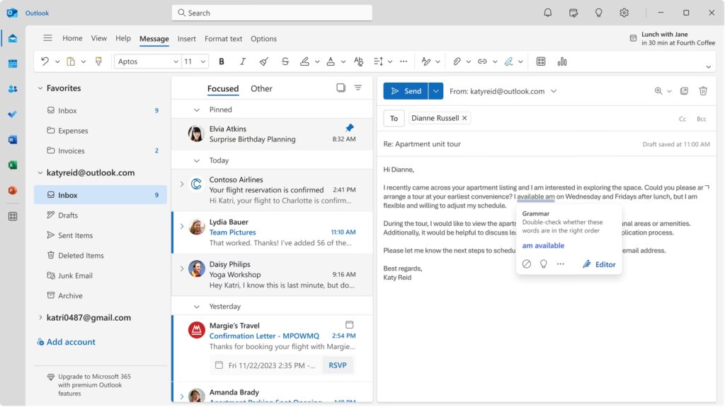 Microsoft Outlook fungerer gnidningsløst sammen med andre Microsoft Office-applikationer som Word, Excel og PowerPoint. Dette gør det utroligt nemt at samarbejde om dokumenter og få adgang til dine filer, uanset hvor du er. Du kan endda åbne, redigere og gemme e-mail-vedhæftninger direkte fra Outlook. Integrationen med OneDrive giver dig mulighed for nemt at vedhæfte filer fra skyen, dele store dokumenter og få adgang til din cloud-lagring direkte fra appen, hvilket strømliner din arbejdsgang.