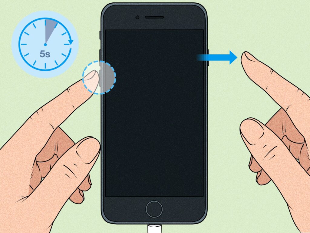 - Hold Sideknappen OG Lydstyrke ned: Mens du stadig holder Sideknappen nede (og din skærm er sort), skal du nu også trykke og holde knappen for lydstyrke ned i præcis 5 sekunder. Tæl langsomt til fem i dit hoved.