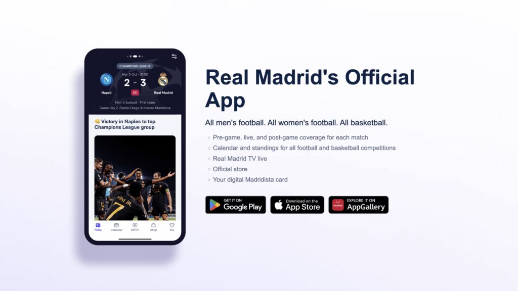 Real Madrid CF har lanceret en opdateret version af deres officielle app, der giver fans en endnu dybere og mere engagerende oplevelse. Fra spændingen ved kampoptakten til efterkampens analyse, alt er lige ved hånden. Oplev alt, hvad der sker i klubben, fra træningssessioner til trupudtagelser, og bliv blandt de første til at kende startopstillingerne.