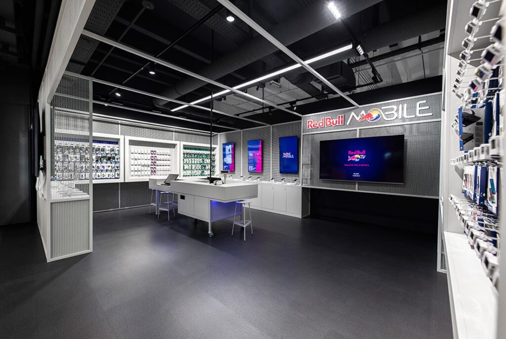 Mange Red Bull-kontorer inkorporerer elementer, der afspejler brandets tætte forbindelse til sport og en aktiv livsstil. Det er ikke ualmindeligt at finde faciliteter som klatrevægge, skateboardbaner, DJ-båse og endda motionsrum direkte på kontoret. Derudover bruges genstande som cykler, motorcykler, skateboards og Formel 1-biler ofte som dekorative elementer i interiørdesignet, hvilket konstant minder medarbejdere og besøgende om brandets kerneværdier og dets passion for bevægelse og ydeevne.