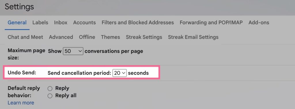 - Find "Fortryd send": Under fanen "Generelt" skal du scrolle ned, indtil du finder sektionen "Fortryd send".