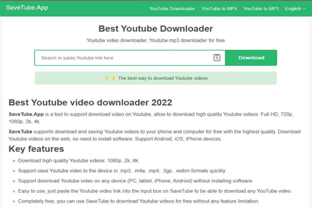 SaveTube er et gratis onlineværktøj, der er designet til at gøre det nemt for brugere at downloade YouTube-videoer i høj opløsning. Dets primære appel ligger i dets brugervenlighed og tilgængelighed. Du behøver hverken at registrere dig, oprette en konto, eller installere nogen form for software på din computer eller mobiltelefon. Alt, hvad der kræves, er en internetforbindelse og URL'en til den YouTube-video, du ønsker at downloade. Fra musikvideoer og underholdningsklip til lange tutorials og dokumentarer, giver SaveTube dig mulighed for at gemme næsten enhver offentlig video med blot et par klik. Denne enkelhed har gjort SaveTube til et foretrukket valg for studerende, indsamlere af digitalt indhold og alle, der ønsker at nyde YouTube uden internetforbindelse.