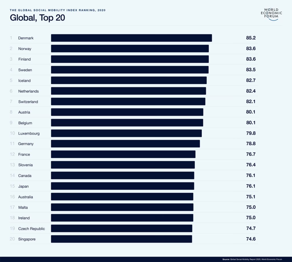 I januar 2020 lancerede Verdens Økonomiske Forum (WEF) sit Global Social Mobility Index, der vurderer 82 økonomier baseret på fem centrale dimensioner af social mobilitet, fordelt på 10 søjler: Sundhed, Uddannelse (adgang, kvalitet og lighed, livslang læring), Teknologi, Arbejde (muligheder, løn, vilkår) samt Beskyttelse og Institutioner (social beskyttelse og inkluderende institutioner).