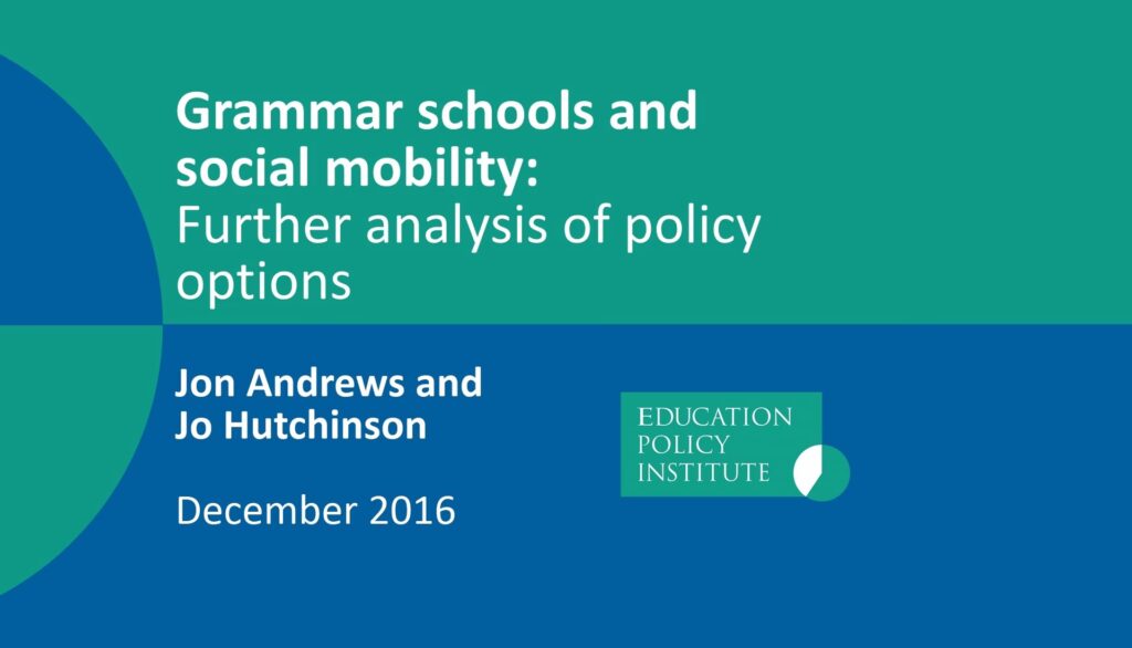 Forskning har vist, at resultaterne fra grammatikskoler ikke er bedre end forventet, når disse forskelle i elevgrundlaget er taget i betragtning. Der er ingen evidensbaseret grundlag for en politik om at øge selektionen. Selvom individuelle elever, der går på grammatikskoler, kan opleve en positiv effekt – de opnår omkring en tredjedel af en karakter højere i hvert af otte GCSE-fag end lignende elever i ikke-selektive skoler – og for elever berettiget til gratis skolemad stiger denne effekt til en halv karakter, er det vigtigt at forstå konteksten.