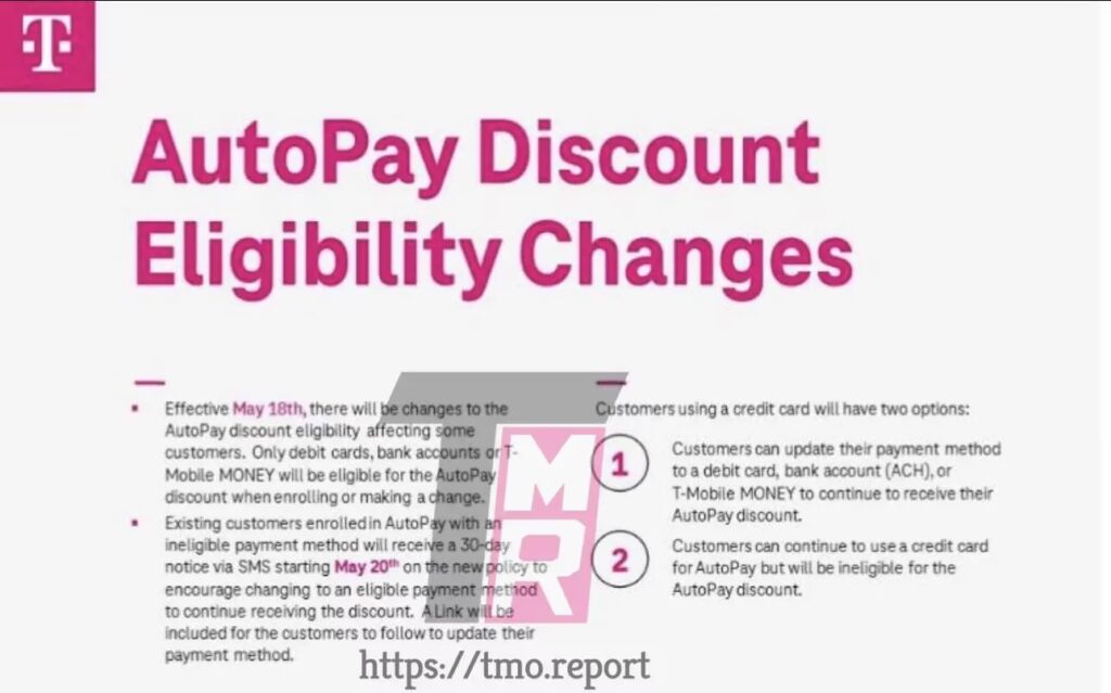 AutoPay is a free service that automatically deducts payments from your linked bank account or debit card to pay your T-Mobile bill. You may also get monthly bill credits for up to eight lines on a qualifying plan when AutoPay (with an eligible payment method) is active for your entire billing cycle.