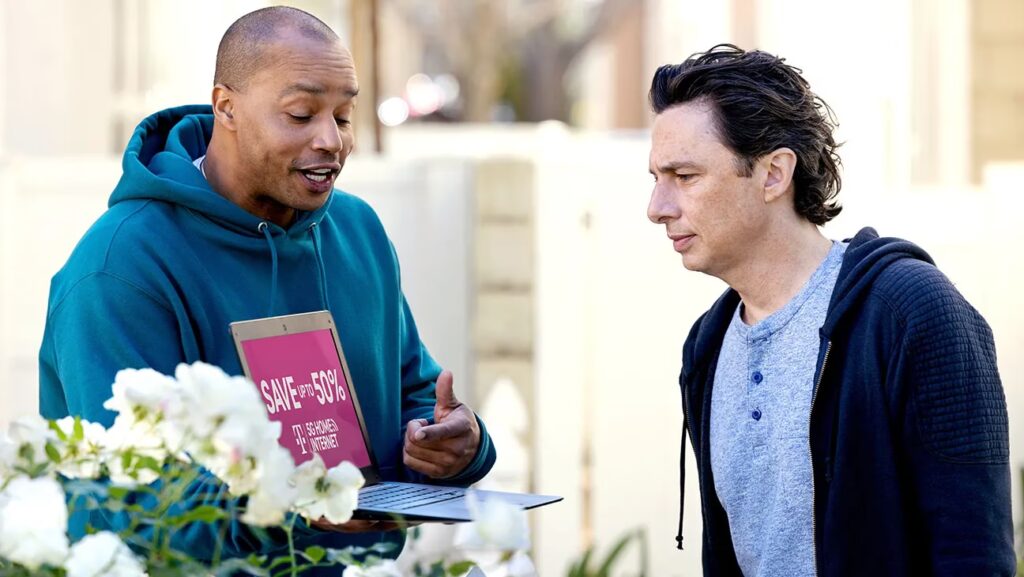 T-Mobile har også succesfuldt udnyttet venskabet mellem Zach Braff og Donald Faison i deres reklamer. Disse to skuespillere, kendt fra den populære serie "Scrubs", har medvirket i flere af T-Mobiles mest succesfulde reklamer. Deres seneste optræden var under Oscar-uddelingen i 2025, hvor de var at finde på scenen og på den røde løber. Til stor morskab for seerne nåede de knap nok at sige et ord, før produktionsteamet startede "wrap-it-up" musikken. Deres ægte venskab og kemi på skærmen skinner dog igennem, trods den begrænsede sendetid.