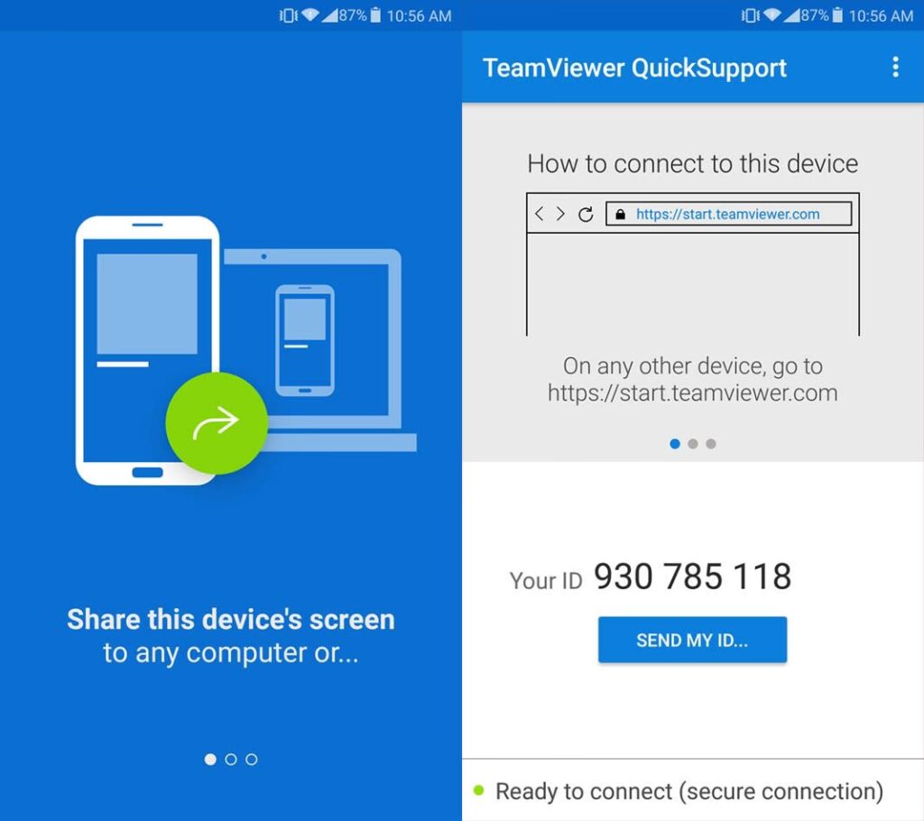 - Supporteren Opretter Forbindelse: Supporteren bruger deres TeamViewer Remote Control-app på deres mobile enhed eller TeamViewer på deres computer til at indtaste dette ID og oprette forbindelse.
