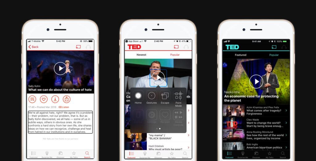 Den officielle TED iPhone-app er specielt optimeret til den lille skærm og introducerer flere meget efterspurgte funktioner, der er skræddersyet til mobiltelefonbrugere, der er på farten. Talernes længde varierer typisk fra 3 til 18 minutter, hvilket gør dem ideelle til korte pauser eller pendling.