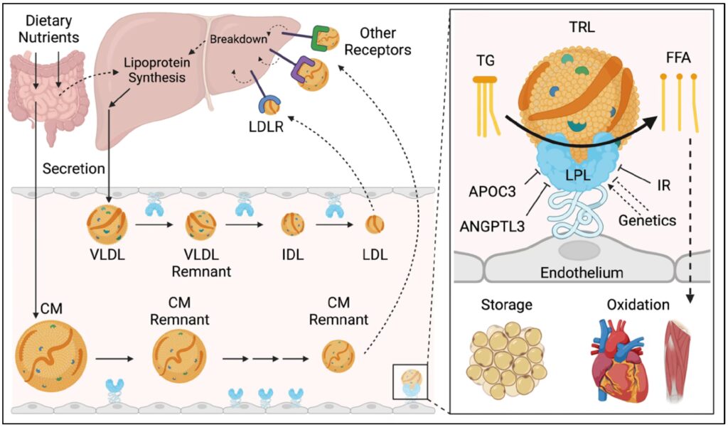 Transporten og omsætningen af TRLs er underlagt en finjusteret regulering. Lipoproteinlipase (LPL) er en central aktør, der sidder på overfladen af blodkarrene i forskellige væv og nedbryder triglycerider i TRLs. LPL's aktivitet påvirkes af en række faktorer: