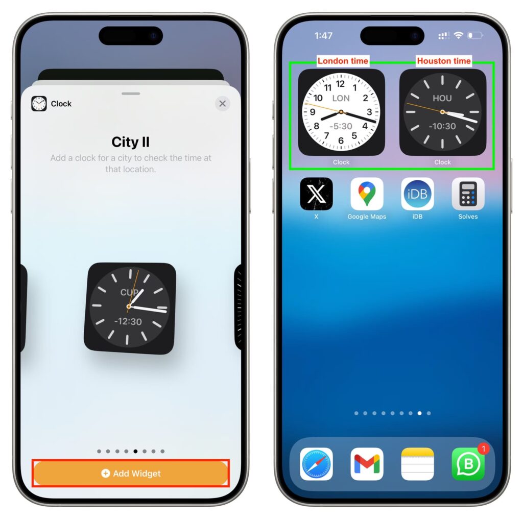 Standard dobbeltur-widgetten i iOS 18 er designet til at vise to tidszoner. Afhængigt af widget-layoutet kan du muligvis tilføje yderligere separate ur-widgets, hvis der er plads på din låseskærm. Dog vil den dedikerede dobbeltur-widget primært fokusere på to specifikke tidszoner.