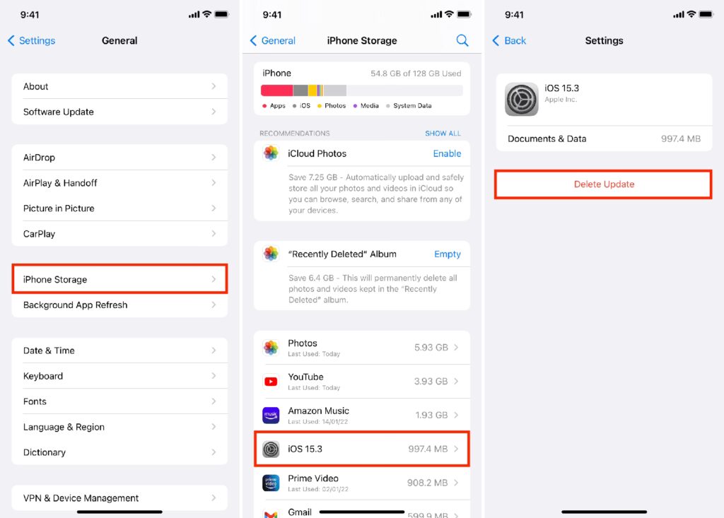 - Slet opdateringsfilen: Hvis opdateringsfilen allerede er delvist downloadet og forårsager problemer, kan du slette den. Gå til Indstillinger > Generelt > iPhone-lagerplads, find 'iOS Software Update' i listen, tryk på den, og vælg derefter 'Slet opdatering'. Derefter kan du prøve at downloade den igen via Indstillinger > Generelt > Softwareopdatering.
